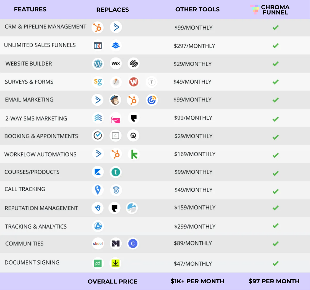 With ChromaFunnel, you save time, reduce costs, and streamline your workflows, eliminating the hassle of managing and integrating separate platforms. It's your one-stop solution for marketing, sales, and business growth!